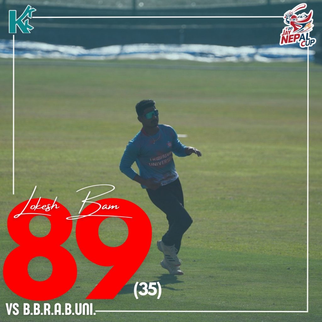 In a thrilling encounter at the Inaugural edition of the Jay Nepal Cup, Tribhuvan University (TU) showcased their dominance with an 8-wicket victory over Babasaheb Bhimrao Ambedkar Bihar University (India) while chasing a target of 135 runs in 20 overs, TU sails to victory in just 15.3 overs, thanks to a explosive innings by Lokesh Bam.