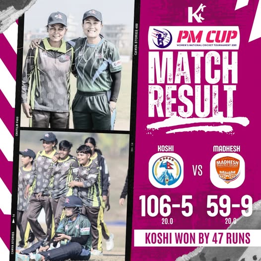 Koshi Province Women are on the top after securing two consecutive victories in the Women’s PM Cup. Their latest clash came against Madhesh Province Women, where they posted 106/5 and restricted their opponents to 59/9, clinching a dominating 47-run win.